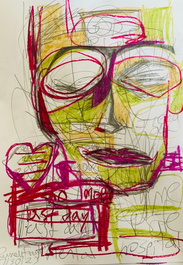 Let me out of this place Crazier here than before. What have I done Chain smoker. Med induced anxiety and paranoia and regret Surrendering to the torture- and it is torture. One of the ghosts that haunts this place Rotted corpse king (what I imagine her breath would look like) Safety shanks because shit feels real here I regret doing this to myself again Filthy foot man’s idea I don’t wanna associate Please come get me The last day (my baby is rescuing me)