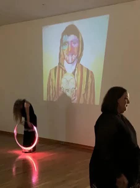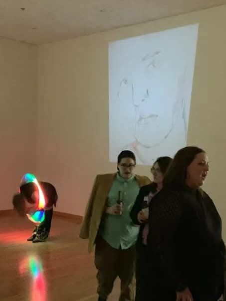 Russell Frantom participates with 5 other artists using projectors to exhibit a large body of original work. 2019 South Bend Museum of Art. Drunk stupid people attend an event where Russell Frantom participates with 5 other artists using projectors to exhibit a large body of original work. 2019 South Bend Museum of Art.Artist Russell Frantom holds a skull while projected onto the wall at South Bend Museum of Art 2019