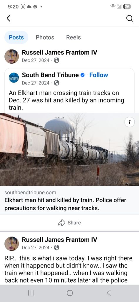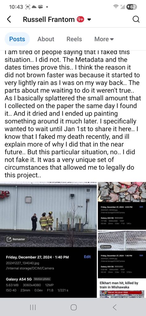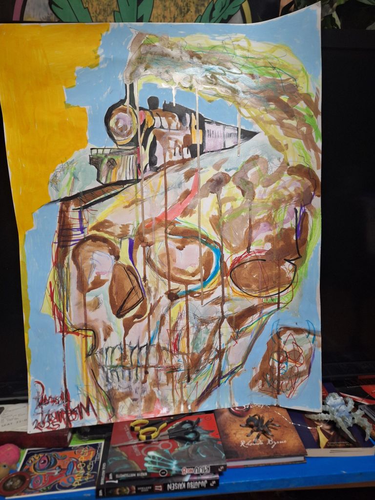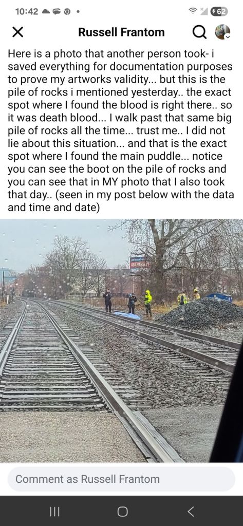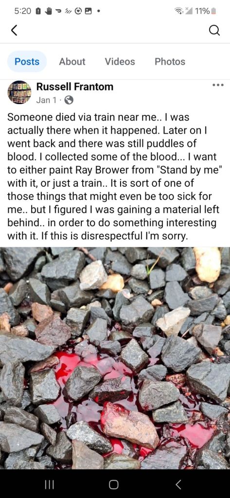Artist Russell Frantom on December 27th 2025 took a small sample of actual human blood from the real scene of a death by train accident in the town he was living in at the time. It immediately caused controversy, mainly on his facebook page (Russell Frantom) , as the artist was subsequently banished from the local art scene of South Bend IN. Completely over it. Russell ended up splashing what he collected on a large piece of paper, letting it dry and then later painting a human skull and train painting around the blood with inks and other media, the painting that he titled “going off the rails on this crazy train” (seen below) 2025 mixed media by Russell Frantom.